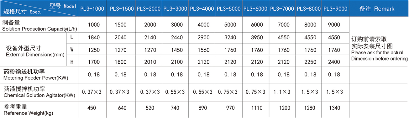PL3 otomatik üç kutu toz hazırlama sistemi, çözünen bir tank, bir kürleme tankı ve bir depolama tankına ayrılır. Manuel veya otomatik olarak kontrol edilebilir. Sistem yapıda kompakttır, otomatik olarak çalıştırılabilir ve hazırlama konsantrasyonu ayarlanabilir.